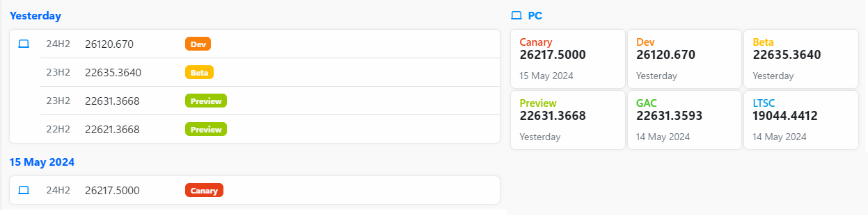 ○ 개발자 채널 [Dev] = Windows 11 : 빌드 26120.670 (= 참가자 빌드)