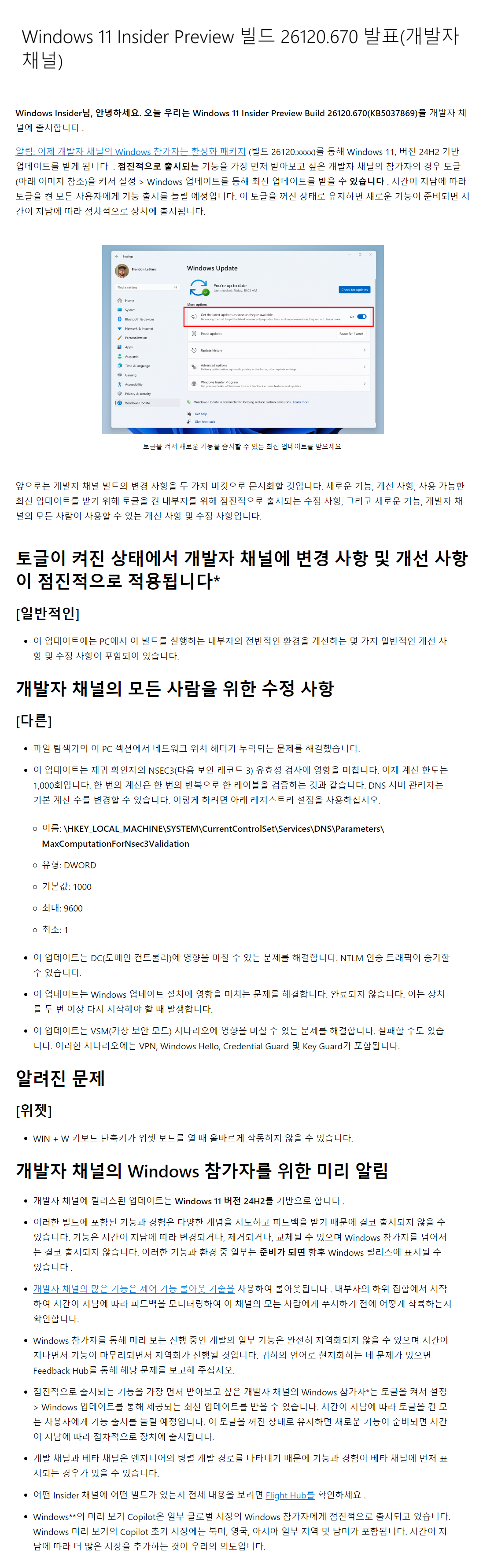 이 빌드는 Windows 11 (Version 24H2) 버전을 위한, 개발자(Dev) 채널의 참가자들에게 배포되는 프리뷰(테스트) 빌드입니다.