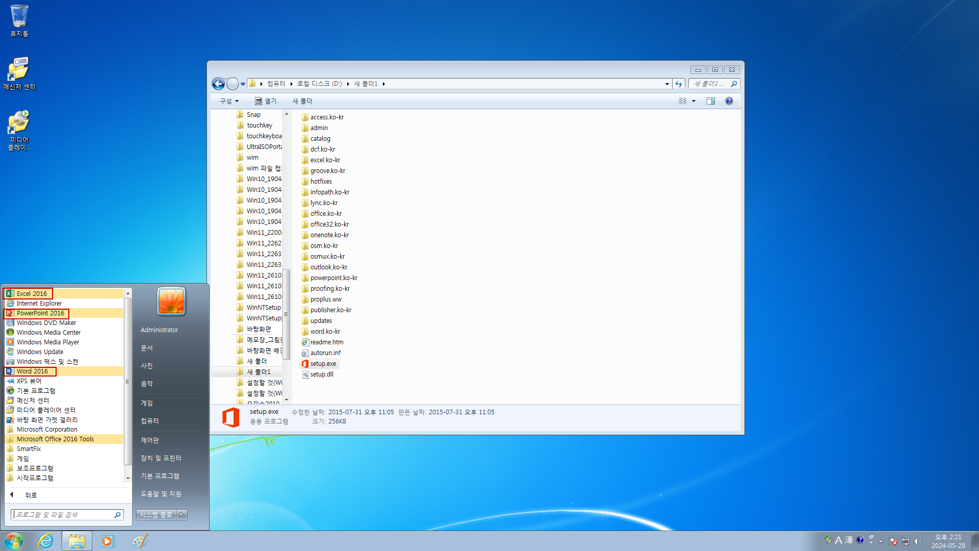 설치가 완료되고 시작메뉴에 아래처럼 excel, Powerpoint, Word 프로그램이 들어있습니다...