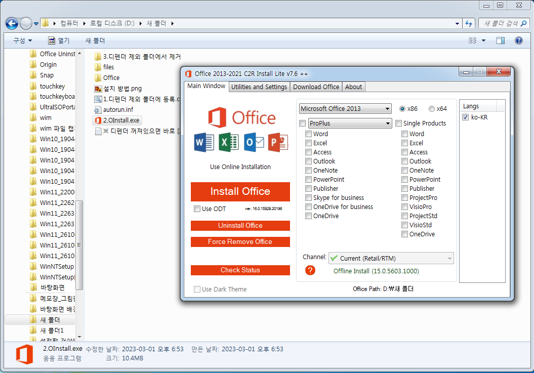 Office 2013~2021 C2R Install Lite v7.6++ 프로그램으로 2013 이상의 오피스를 설치할 수는 없습니다.