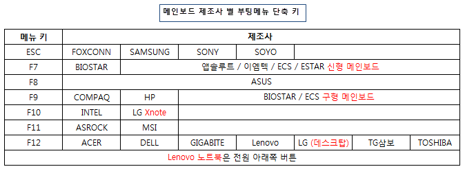 1) PE로 부팅하기전에 아래 표를 참조하여 자신의 메인보드에 맞는 [부팅 메뉴 단축키]를 알아둡니다.