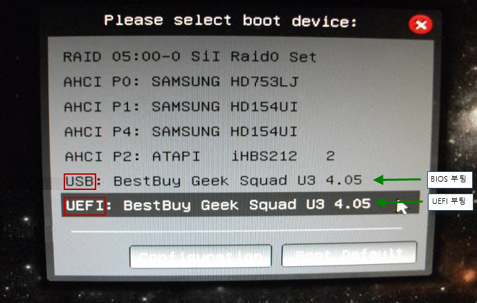 2) 전원을 넣고 바로 [부팅 메뉴 단축키]를 몇번 연타로 눌러줍니다.