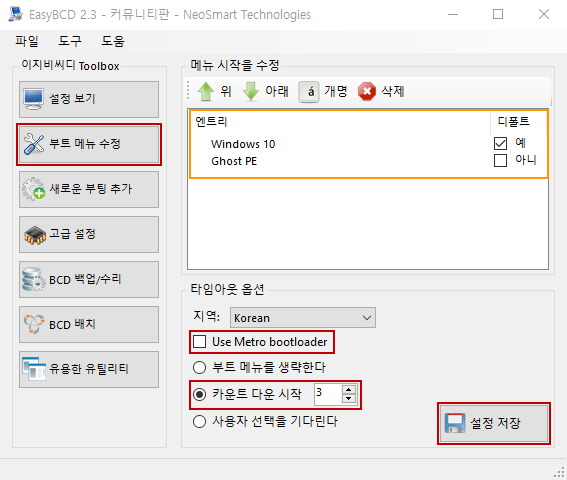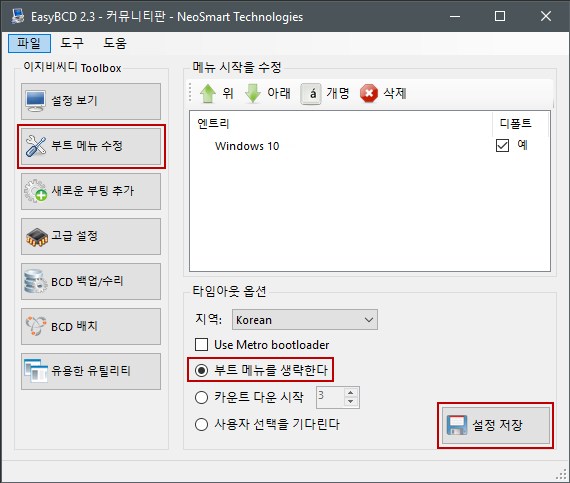 [부트 메뉴 수정] 버튼을 눌러서 "카운트 다운 시작 : 2~3초" 정도로 맞춰줍니다.