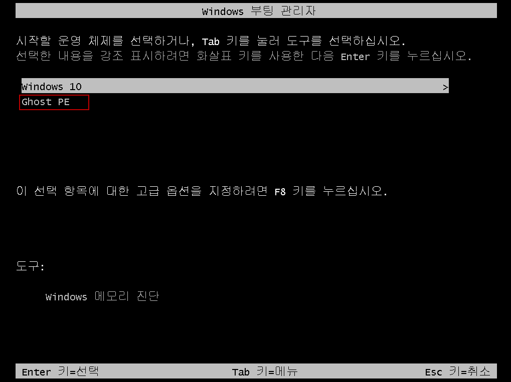 재부팅하면, 부팅 시작시 아래 그림처럼 메뉴가 나오고, Ghost PE 메뉴를 선택하면 바로 PE로 부팅됩니다.