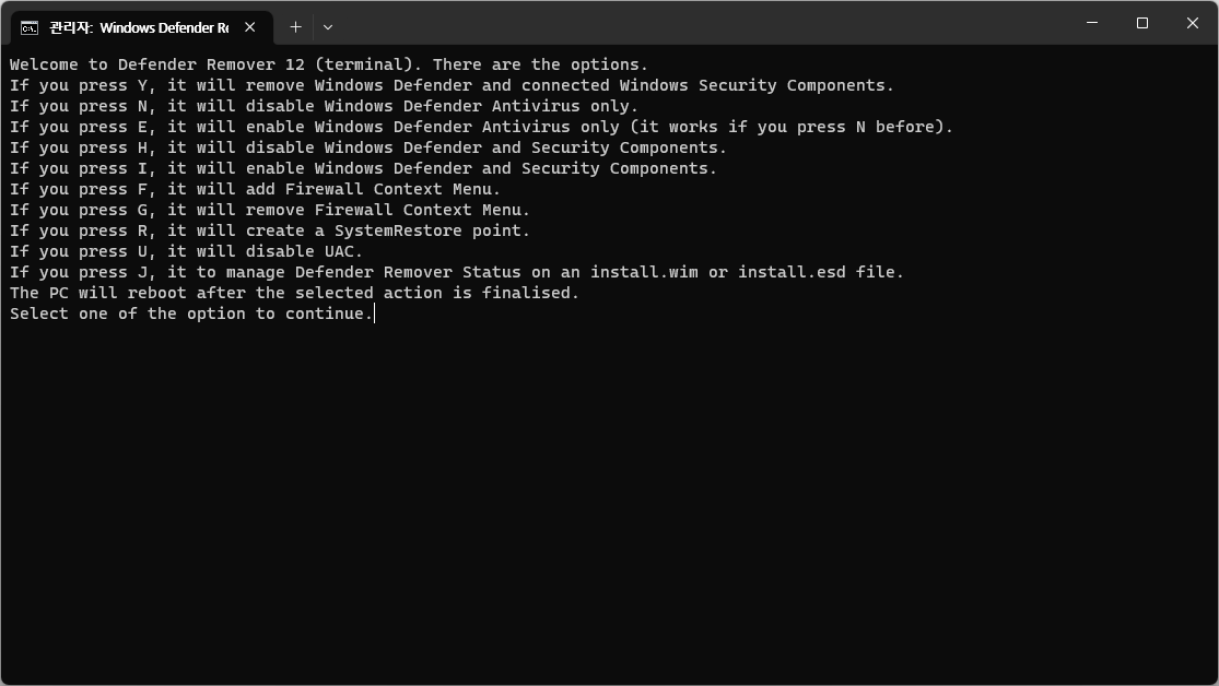 위의 압축파일을 풀어서 "remove_defender.cmd" 파일을 실행시켜줍니다.