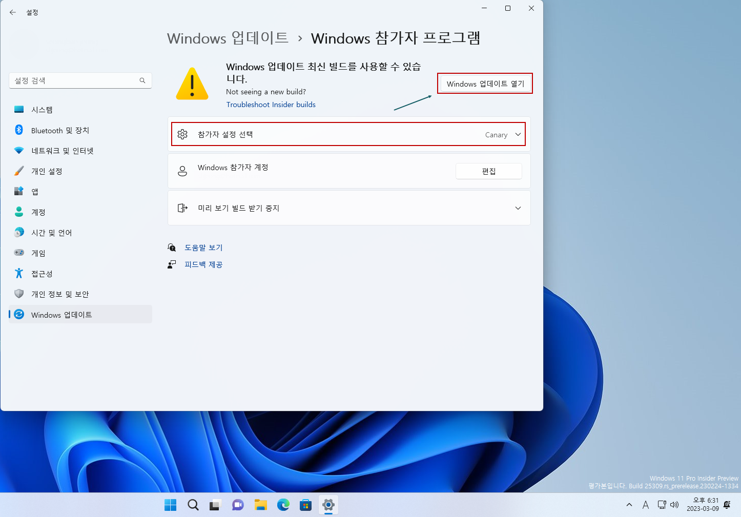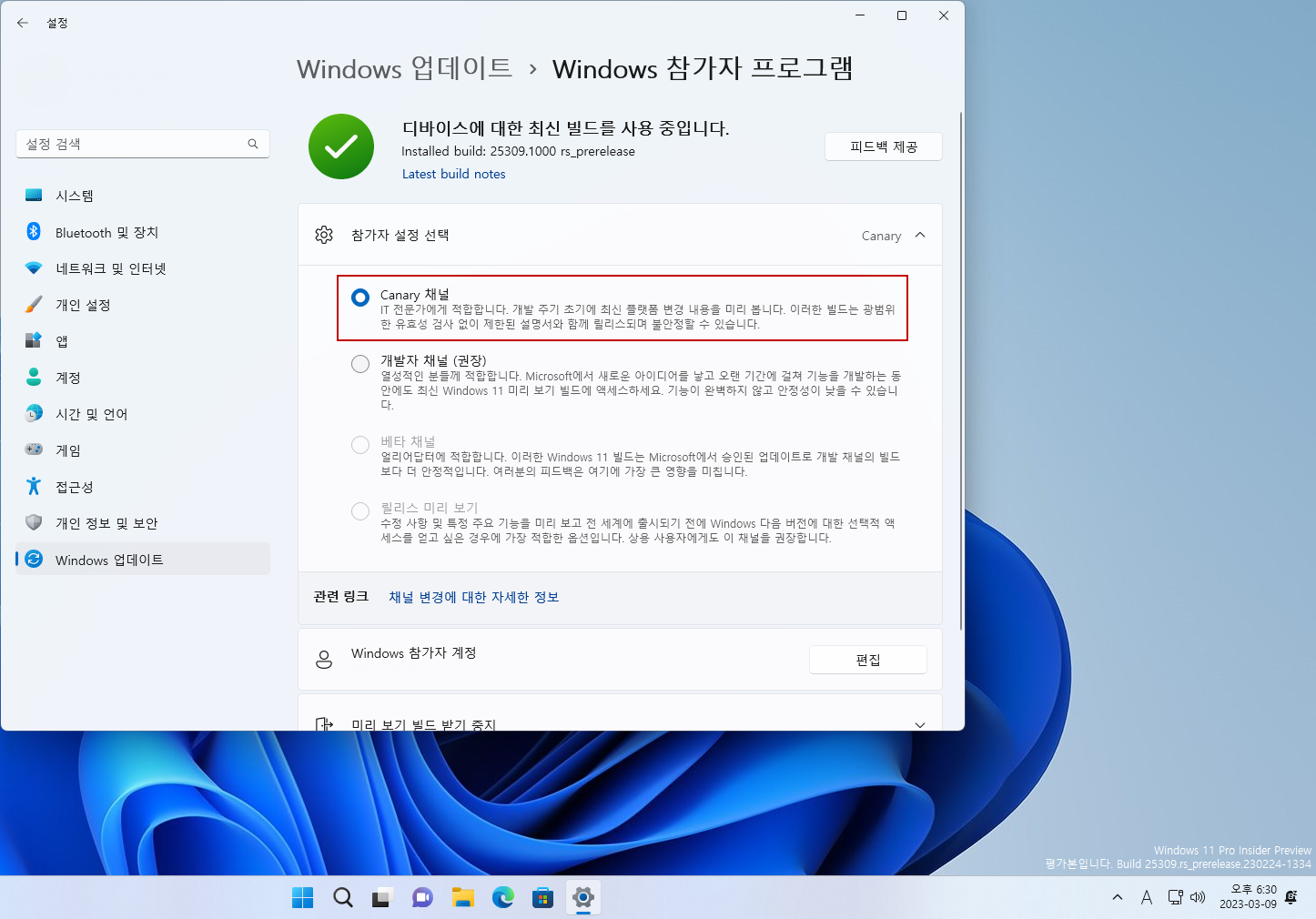 ※ 주의사항 : 한번 윈도우를 다른 채널 빌드로 업그레이드하면 되돌릴 수 없습니다.