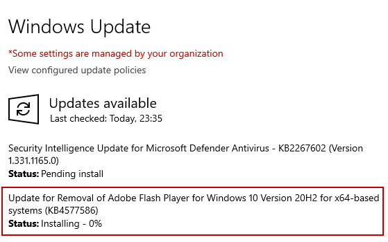 Update for Removal of Adobe Flash Player for Windows 10 Version 2004 & 20H2 (KB4577586)
