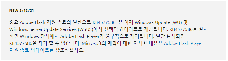 Adobe Flash Player 제거를 위한 2020년 10월 27일 업데이트(KB4577586) 입니다. 얼마 전에 뉴스에 보도되었던 Adobe Flash Player 제거 패치 파일입니다. 이 패치 파일을 적용하면 더이상 Adobe Flash Player를..