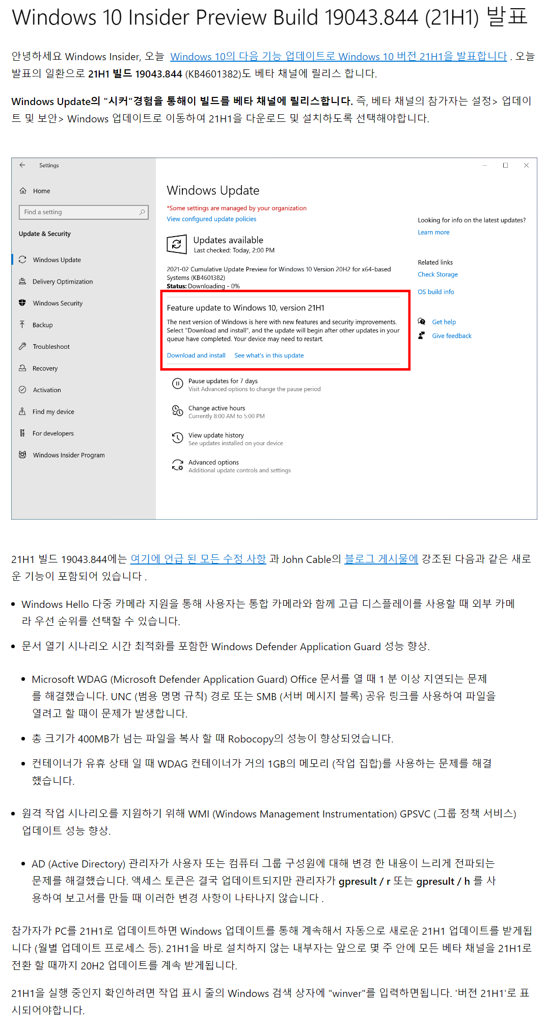 이번달 안에 21H1 버전이 배포될 거라했는데, 정말로 오늘 배포되었네요..