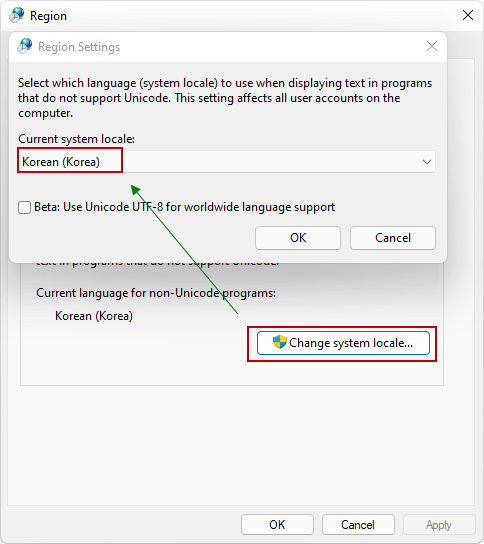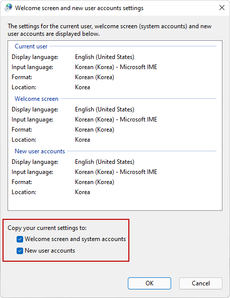 설치화면에서 키보드 / 지역을 "Korean / Korea"로 설정해줍니다.