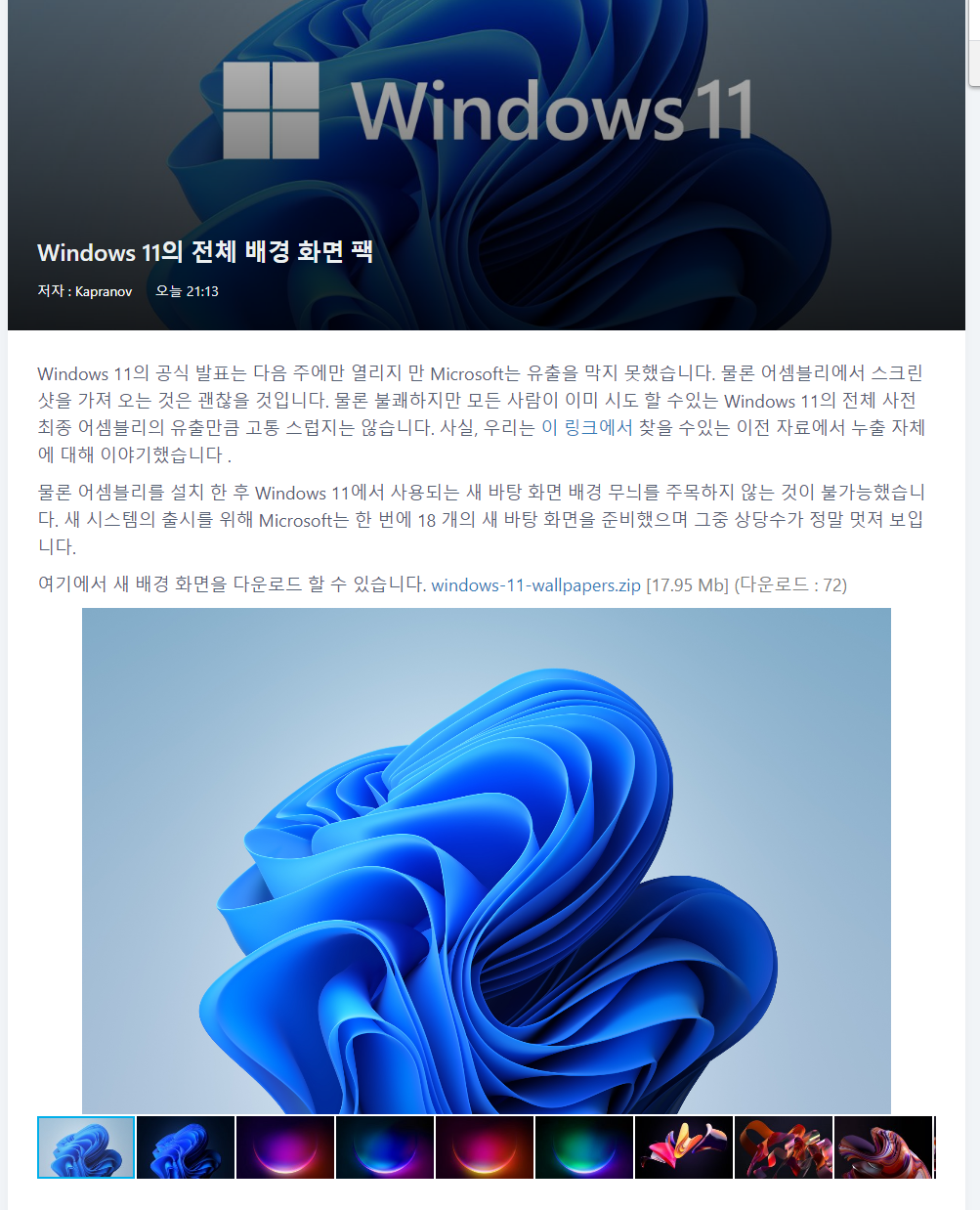 여기에서 새 배경 화면을 다운로드 할 수 있습니다. windows-11-wallpapers.zip [17.95 Mb] (다운로드 : 72)
