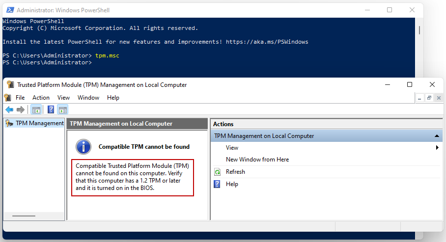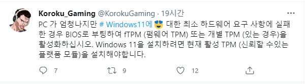 아래는 TPM 2.0이 꺼져있거나 없을 때, Windows 11 설치시 보여주는 메시지입니다.