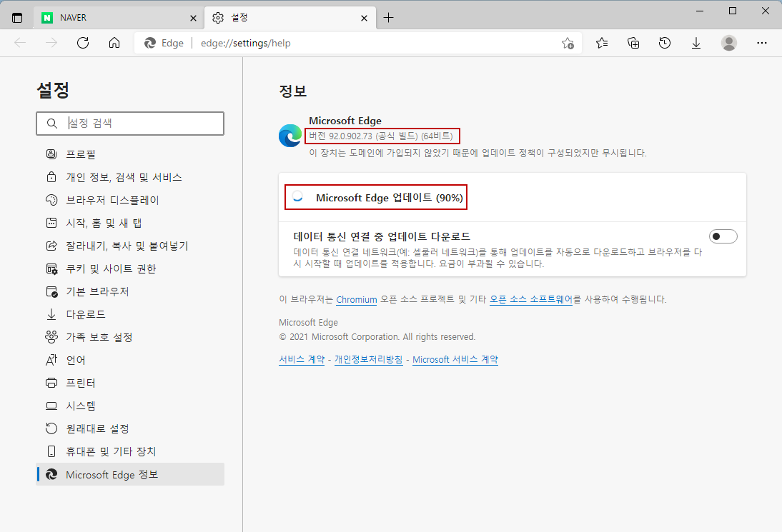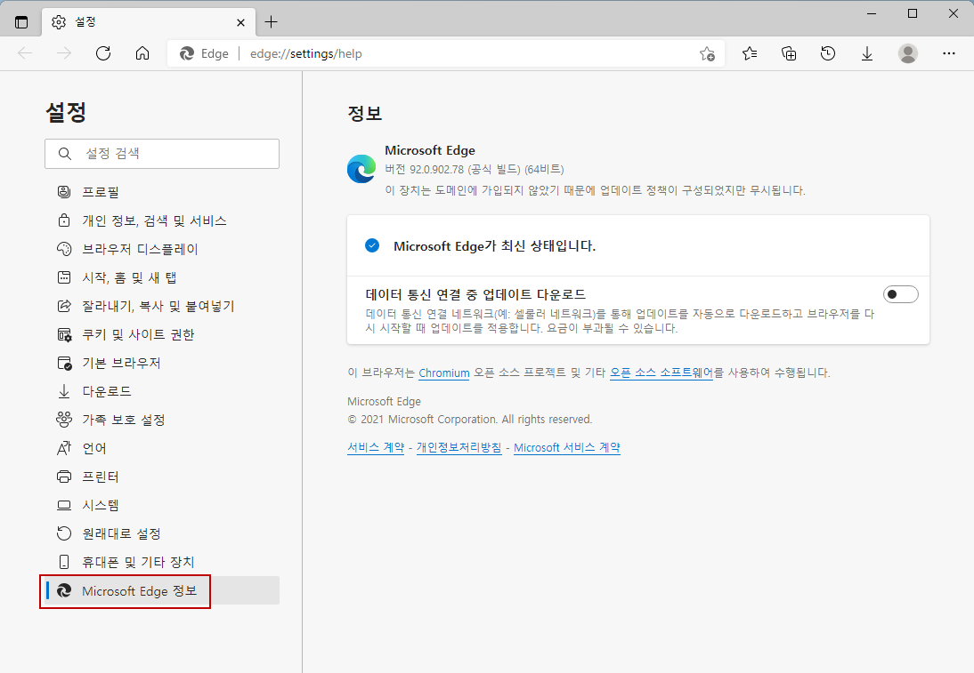 [설정]창을 열어서 제일 밑에 있는 [Microsoft Edge 정보]를 클릭해주면 됩니다..ㅎㅎ
