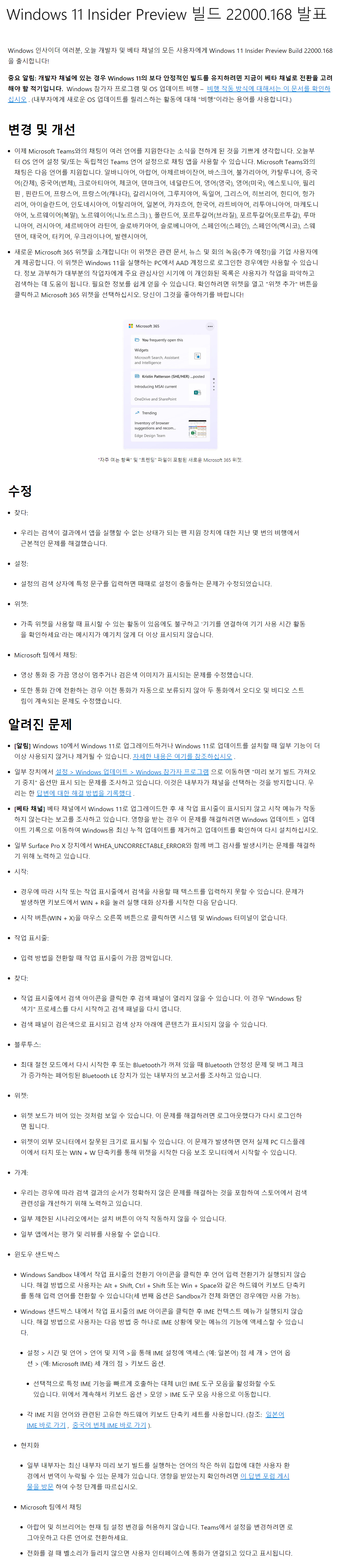 오늘 Windows 11, 22000.168 빌드가 배포되었습니다.