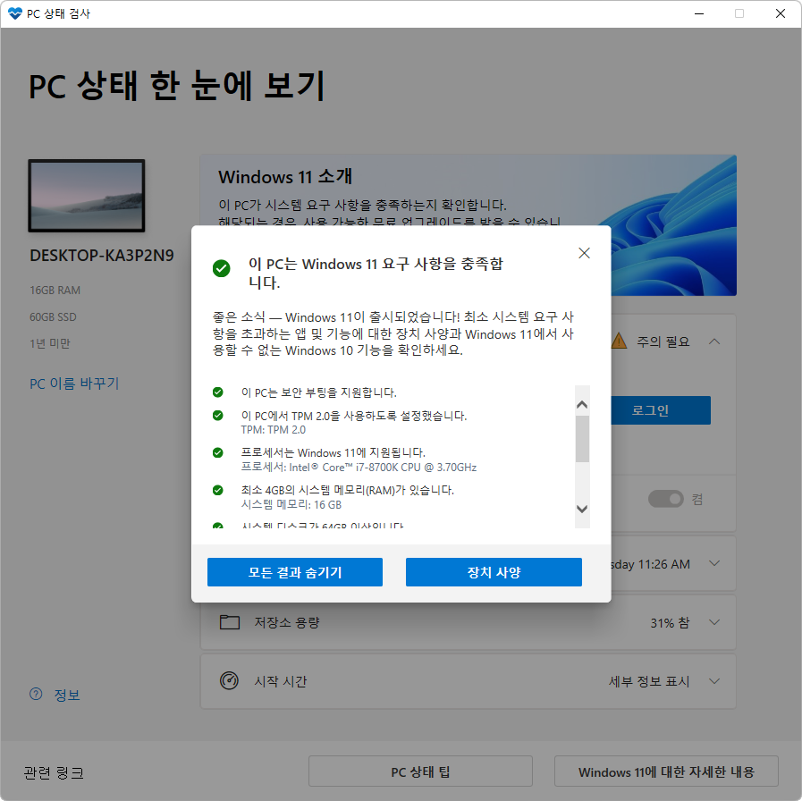요구사항에 충족하지 않으면..... 윈도우 자동업데이트에 11로 업그레이드 안내가 안뜹니다.ㅠ