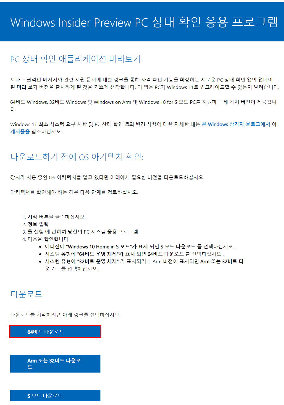 https://www.microsoft.com/en-us/software-download/windowsinsiderpreviewpchealth?wa=wsignin1.0 (MS 로그인 필요)