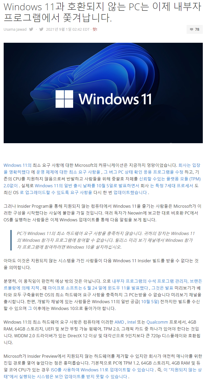 | Windows 11에서 intel 6, 7세대 CPU를 지원하지않는 이유 (6) | 2021.09.07 |
