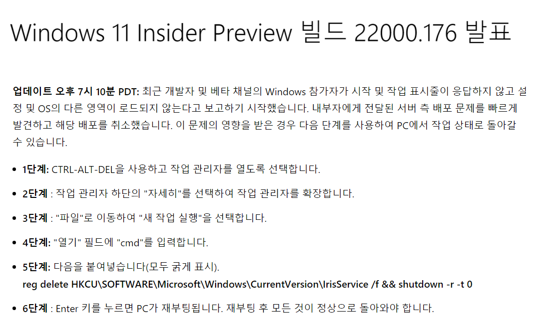 업데이트 오후 7시 10분 PDT: 최근 개발자 및 베타 채널의 Windows 참가자가 시작 및 작업 표시줄이 응답하지 않고 설정 및 OS의 다른 영역이 로드되지 않는다고 보고하기 시작했습니다. 내부자에게 전달된 서버 측 배포 문제를 빠르게 발견하고 해당 배포를 취소했습니다. 이 문제의 영향을 받은 경우 다음 단계를 사용하여 PC에서 작업 상태로 돌아갈 수 있습니다.