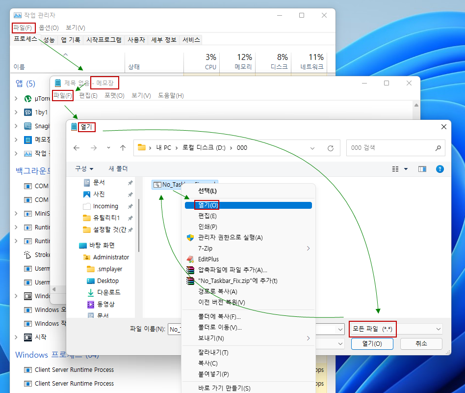 CTRL+ALT+DEL → 작업관리자 → 파일 → 새작업 실행 → [ notepad → 파일 → 열기 → 오른쪽 하단의 파일 이름 → 모든 파일(*.*) → No_Taskbar_Fix.cmd → 마우스 오른쪽 버튼 → 열기 ]