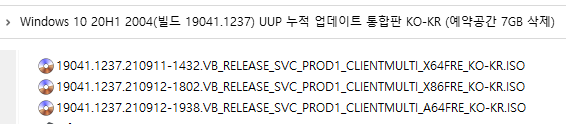 2) 예약공간 7GB 삭제 패치가 적용된 버전 (예약공간 7GB 삭제 패치 + 시작메뉴 사각 배경 제거 + 21H2의 탐색기 아이콘 변경 적용.ㅎ 권장)
