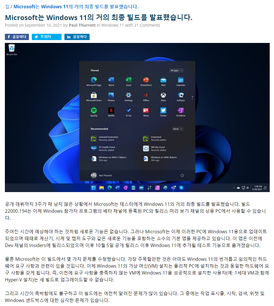 | MS, Windows 11이 지원되지 않는 PC에도 업그레이드 허용 (34) | 2021.09.23 |