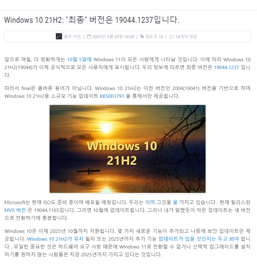 10월 5일에 출시될 Windows 10, 21H2의 최종버전이 19044.1237이 될 것이라고 합니다...ㅎ