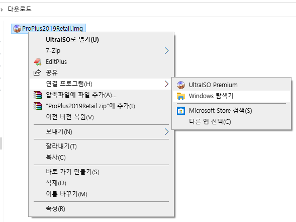 img 파일 → 오른쪽 마우스 버튼 → 연결 프로그램 → Windows 탐색기 → 가상 DVD 드라이브에 마운트됨