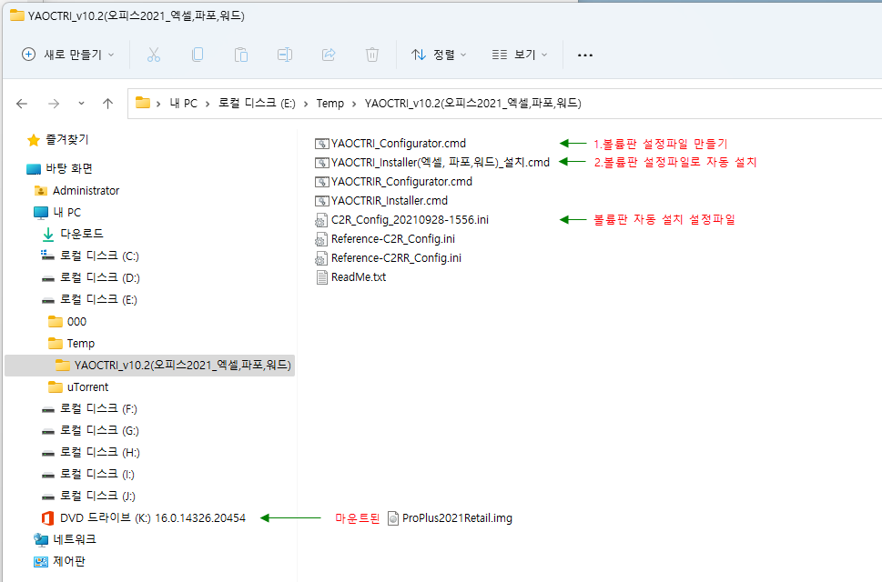 1) ProPlus2021Retail.img (= professional plus) 파일을 받아서 탐색기에 마운트한 후에 그냥 설치하시면 됩니다.