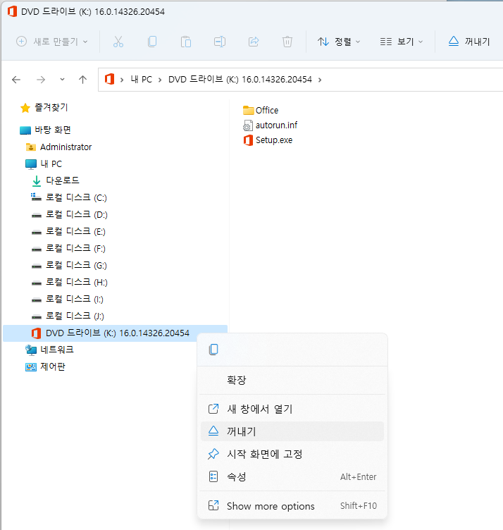 11) 설치가 끝나면 마운트한 ISO 파일을 탐색기에서 꺼내줍니다.