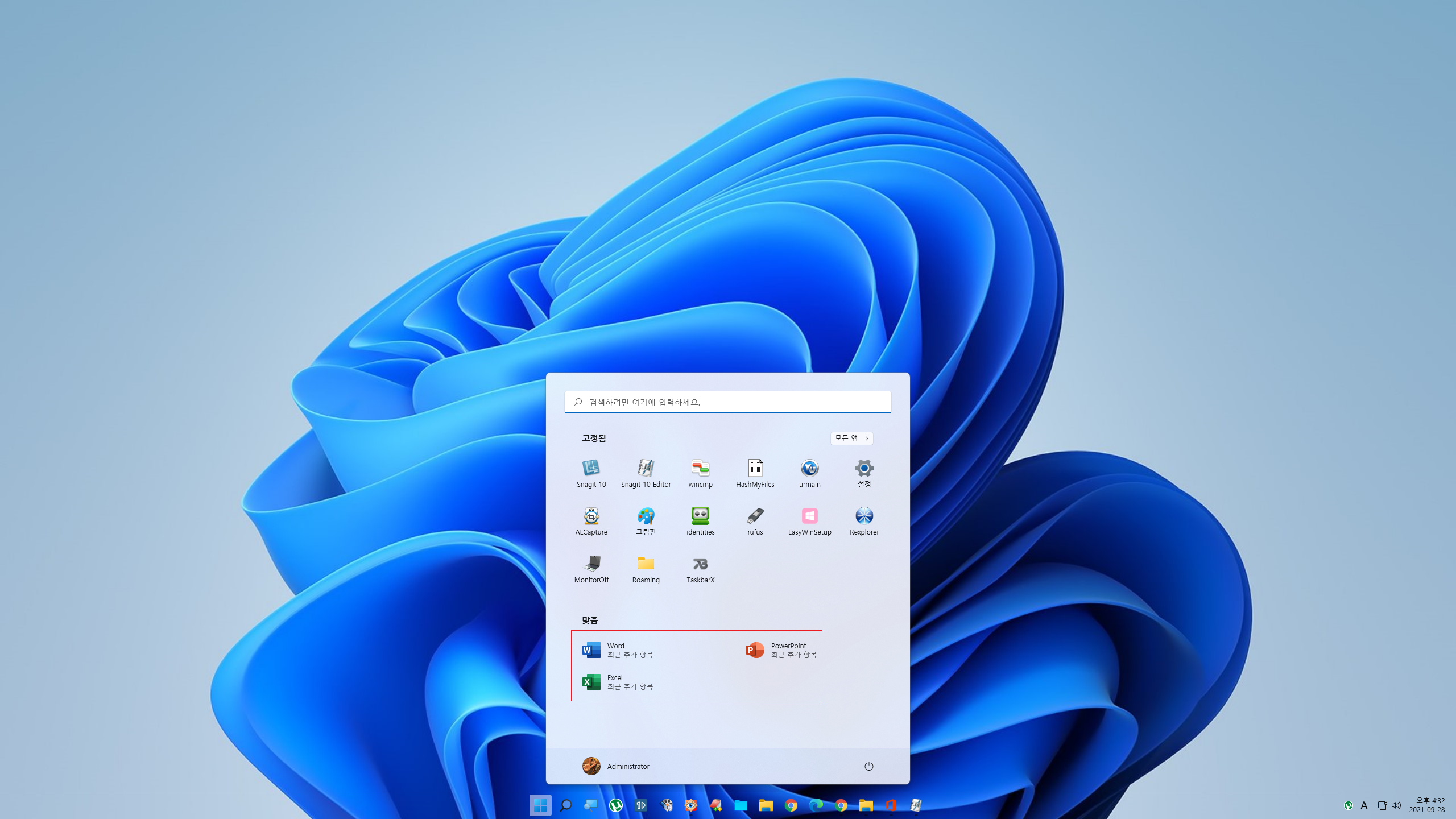 12) 이제 [시작] 메뉴를 누르면 방금 설치한 Excel, PowerPoint, Word 아이콘이 보일 겁니다.