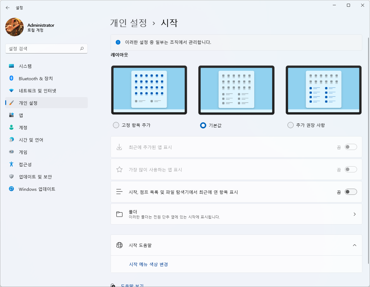 시작메뉴에 더 많은 핀을 고정시킬 수 있도록 [맞춤] 항목을 위 아래로 이동시킬 수 있는 기능입니다.ㅎ