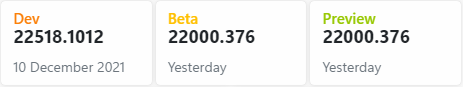 ○ 개발자 채널 [Dev] = Windows 11 : 빌드 22518.1012 (= 참가자 빌드)