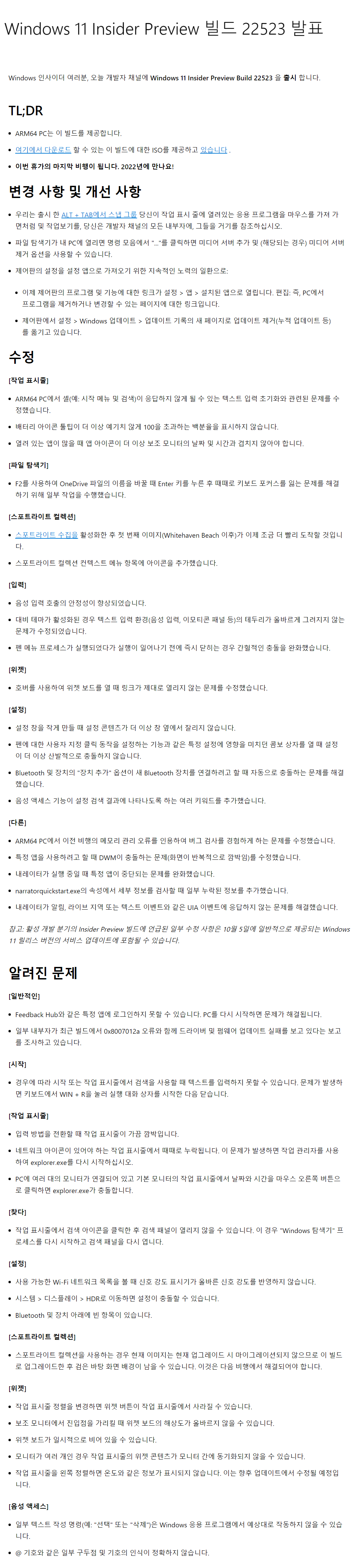 오늘 Windows 11, 22523.1000 빌드가 배포되었습니다.