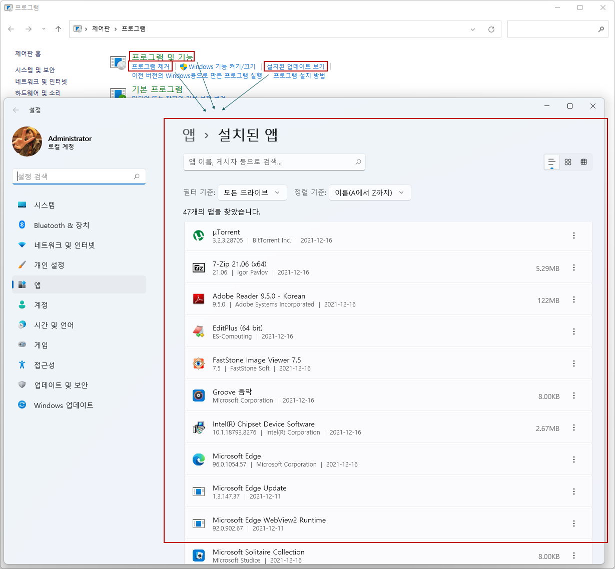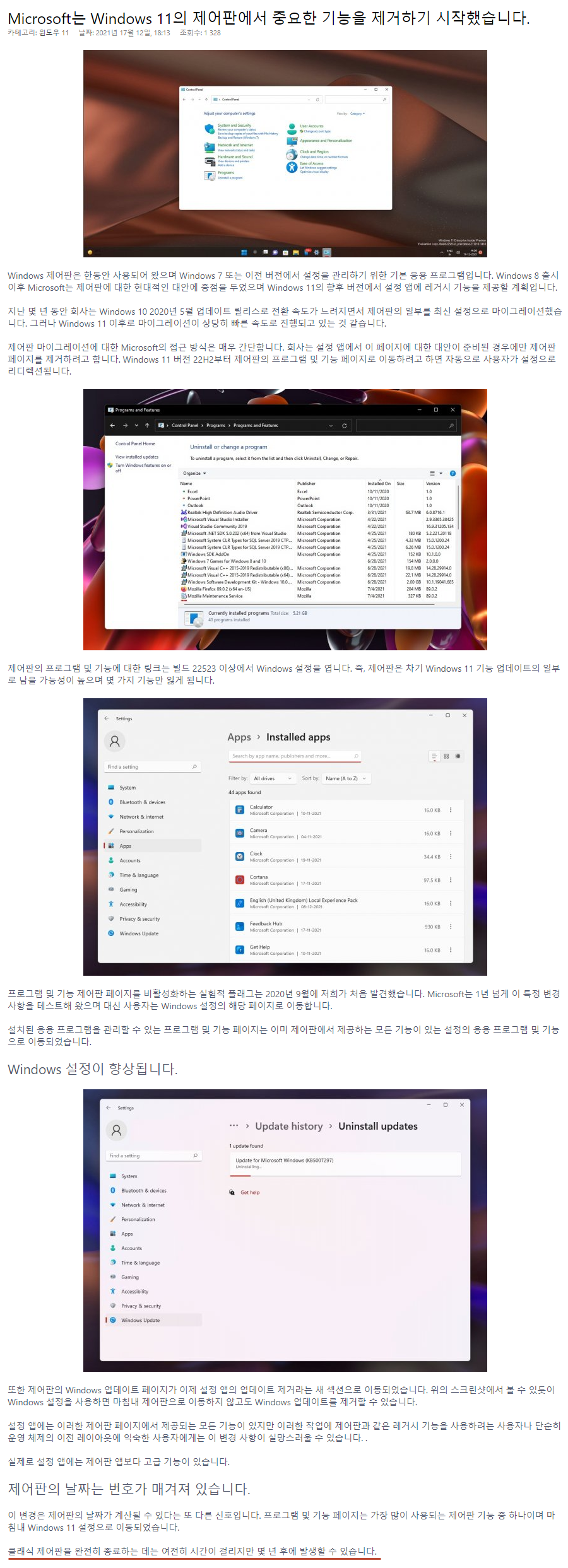 최신 프리뷰 빌드 22523.1000에서 제어판의 [프로그램 및 기능]의 [프로그램 제거]가 설정창으로 이동되었네요..ㅎ