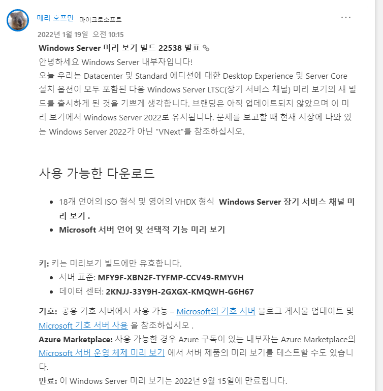 서버 버전 Insider Preview 빌드 22538 배포를 시작했네요...