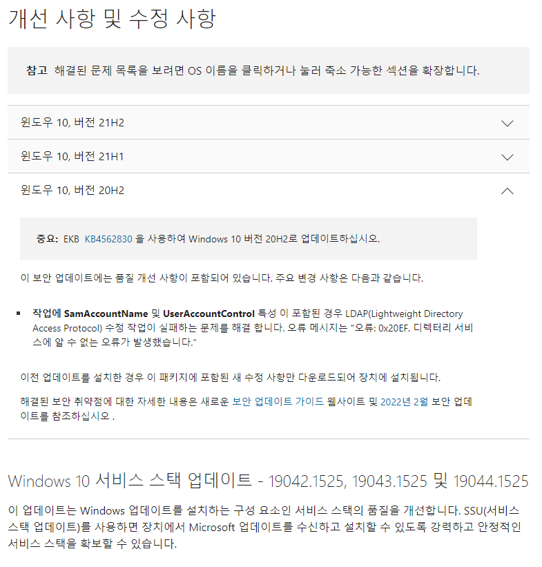 1) 21H2 버전 2109(빌드 19044) & 21H1 버전 2104(빌드 19043) & 20H2 버전 2009(빌드 19042) & 20H1 버전 2004(빌드 19041) : 2022-02-08
