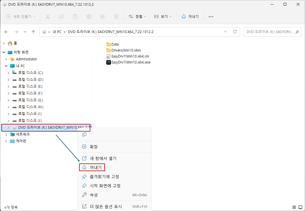 설치가 끝나면 탐색기 트리에서 가상 DVD 드라이브를 선택하고 마우스 오른쪽 버튼을 눌러서 [꺼내기] 메뉴를 선택해주면 됩니다.