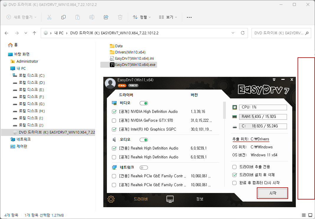 임시로 추출되는 드라이버는 C:\Driver 폴더에 풀어지면 작업이 끝나면 이 폴더는 자동 삭제됩니다.