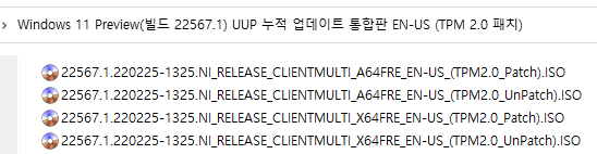 아래 파일은 UUP dump에서 만든 스크립트를 이용해서 MS에서 배포하는 파일(ESD, cab파일)로 만든 순수 ISO 파일입니다.