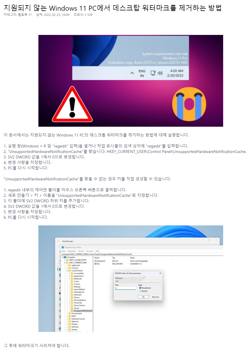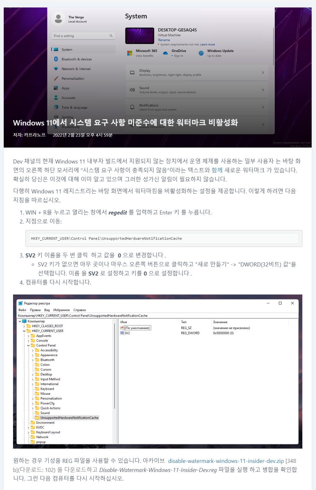 얼마전에는 22557.1 프리뷰 빌드에 적용되었던 "시스템 요구 사항이 충족되지 않았습니다" 경고 워터마크가