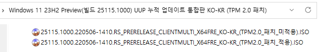 아래 파일은 UUP dump에서 배포하는 스크립트를 이용해서 MS에서 배포하는 파일(ESD, cab파일)로 만든 순수 ISO 파일입니다.