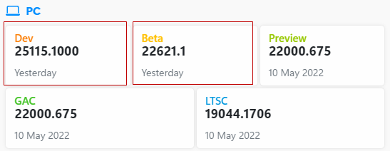 - 미리보기 채널 : 일반 사용자가 곧 사용할 수 있게 될 기능을 소개하도록 설계. 곧 Windows 사용자에게 제공될 테스트