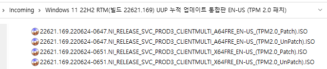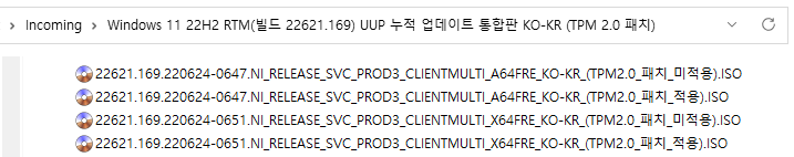 아래 파일은 UUP dump에서 배포하는 스크립트를 이용해서 MS에서 배포하는 파일(ESD, cab파일)로 만든 순수 ISO 파일입니다.