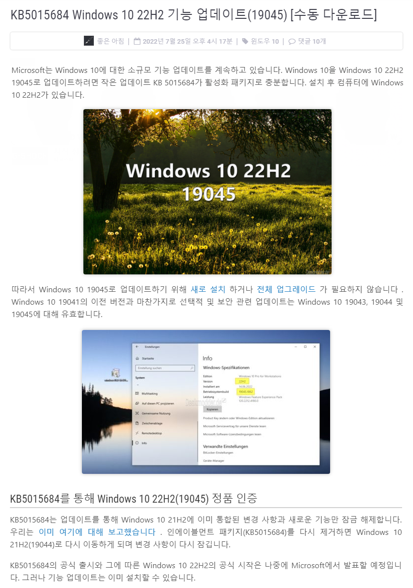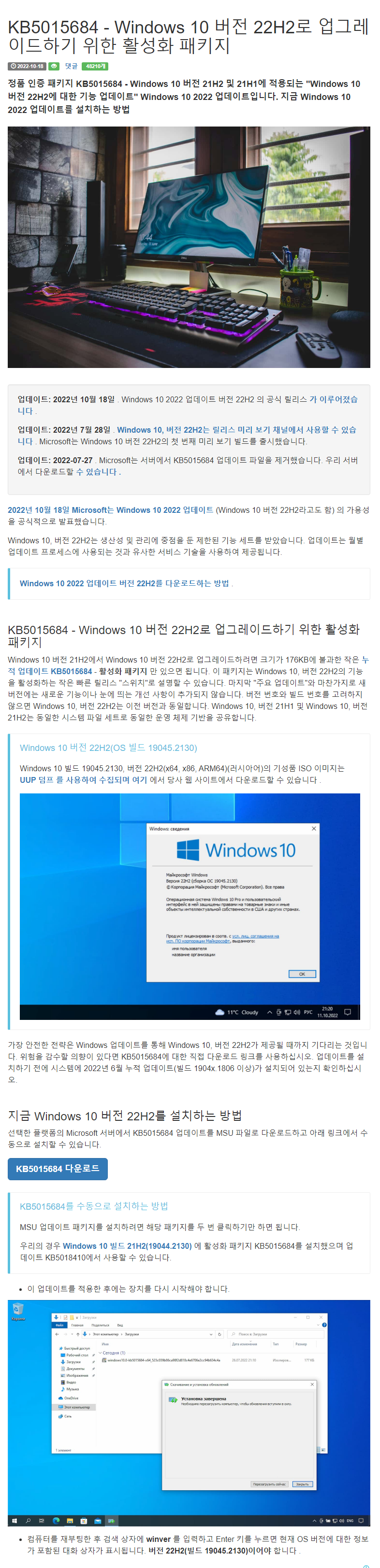 아직 22H2(빌드 19045.xxx)는 정식 출시 전이지만 미리 22H2를 사용하실 분들은 아래 기능 업데이트 패키지 파일(KB5015684)을 설치하시면 됩니다.ㅎ ㅎㅎ