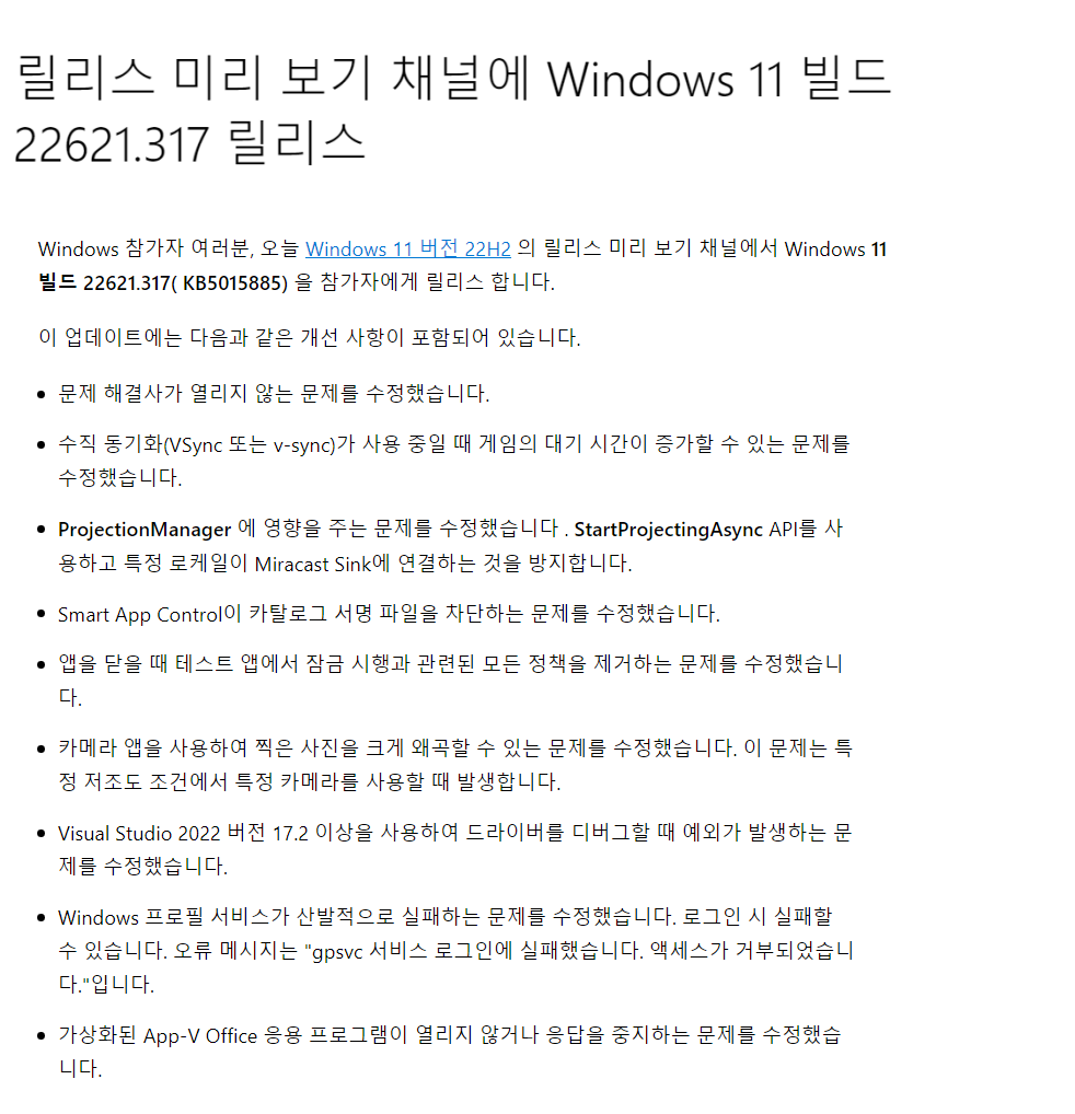 KB5015885 = 누적 업데이트(22621.317) (Cumulative update : CCU) (2022-07-29)