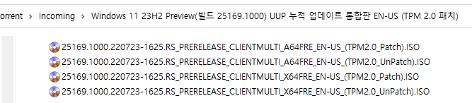 아래 파일은 UUP dump에서 배포하는 스크립트를 이용해서 MS에서 배포하는 파일(ESD, cab파일)로 만든 순수 ISO 파일입니다.