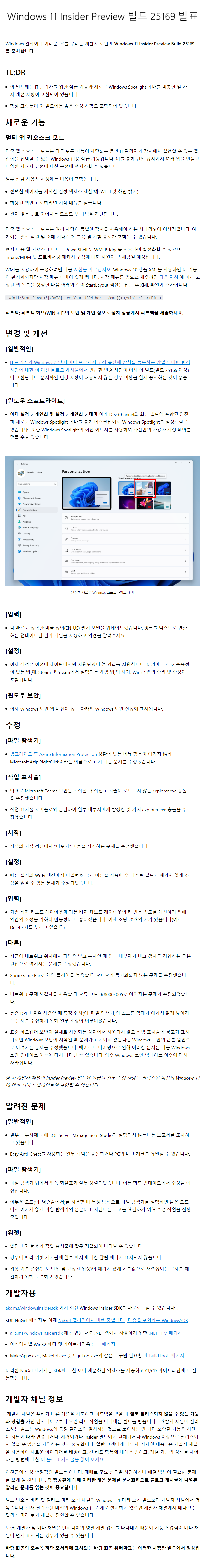 ○ 개발자 채널 [Dev] = Windows 11 : 빌드 25169.1000 (= 참가자 빌드)