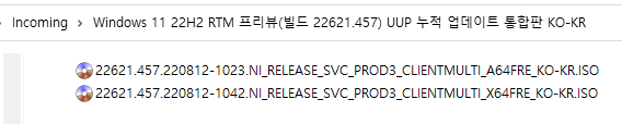 아래 파일은 UUP dump에서 배포하는 스크립트를 이용해서 MS에서 배포하는 파일(ESD, cab파일)로 만든 순수 ISO 파일입니다.
