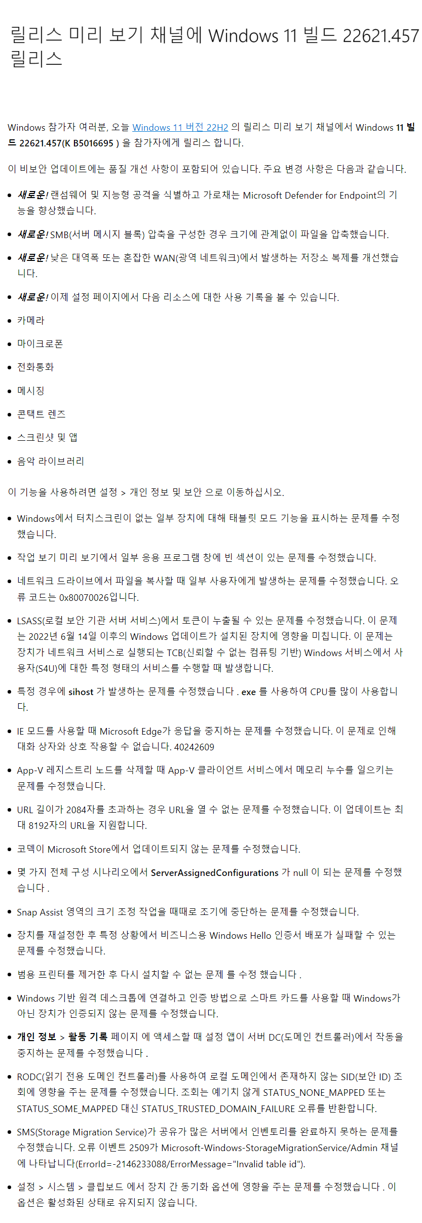 KB5016695 = 누적 업데이트(22621.457) (Cumulative update : CCU) (2022-08-23)