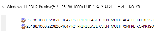 아래 파일은 UUP dump에서 배포하는 스크립트를 이용해서 MS에서 배포하는 파일(ESD, cab파일)로 만든 순수 ISO 파일입니다.